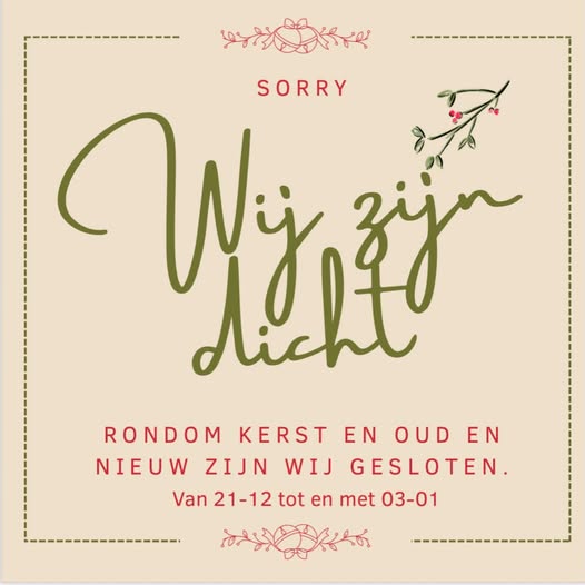 Feestdagen gesloten Feestdagen gesloten MWP-R-Creations2025-12-21T11:55:15+01:0021 december 2025| Tussen kerst en oud & nieuw doen ook wij het even rustig aan. Daarom is onze [...] Lees meer
